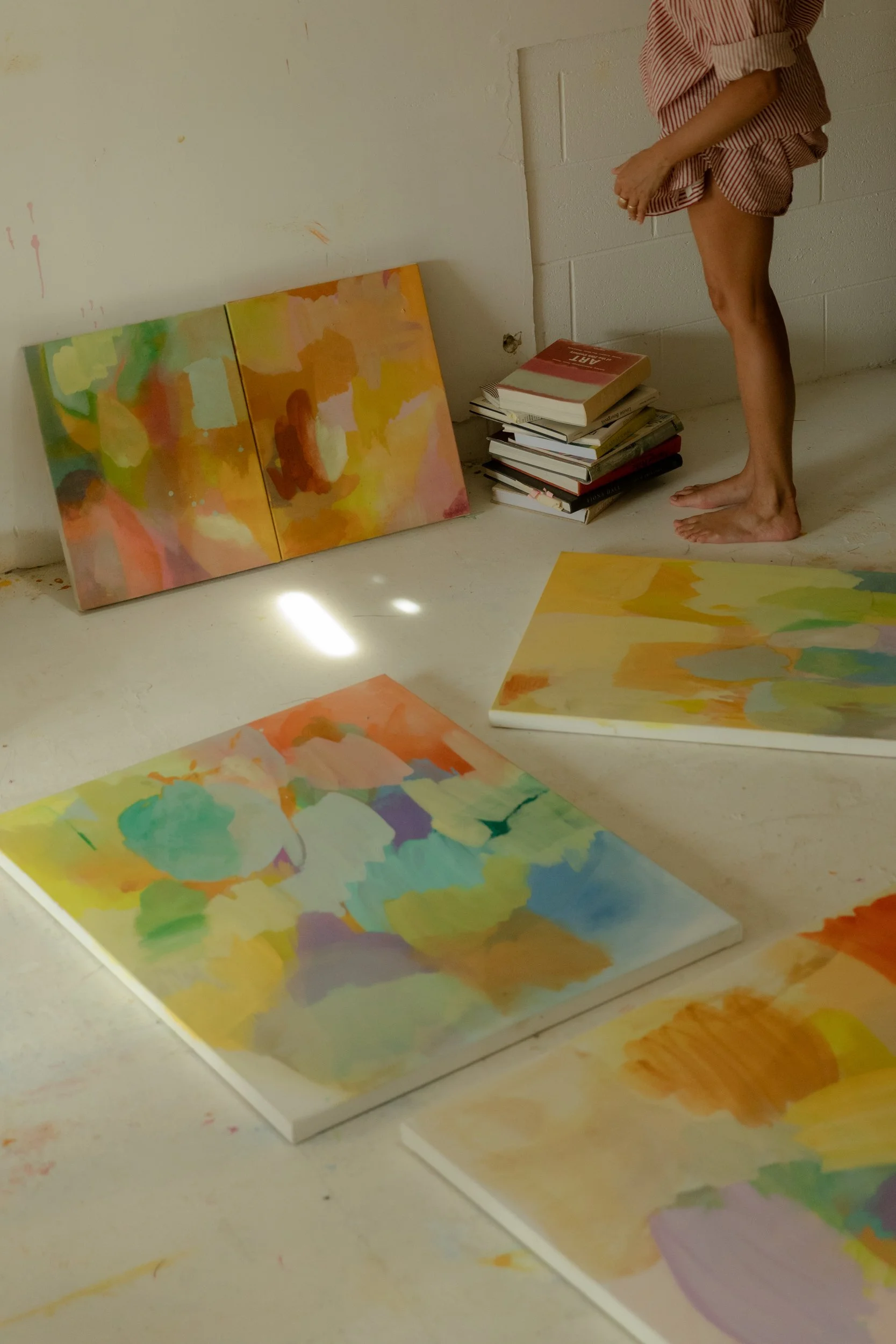 Now based on Bundjalung Country in the Northern Rivers of NSW, we recently visited Sara at her home studio. It is clear her love of colour is not just limited to her paintings, with cheerfully coloured furniture and objects layered throughout alongside her works in progress on the walls. We discuss all things creativity, including how she fits painting into her life where she can between raising two young boys and working on her online gallery, Agnes Contemporary. More on a day in the life of Sara Darling below.
